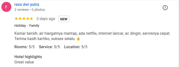 Sangat mengesankan, tempat nyaman dan pusat kota jadi kemana mana janjian dan meeting sangat efektif.. Terima kasih Kartiko Palagan..